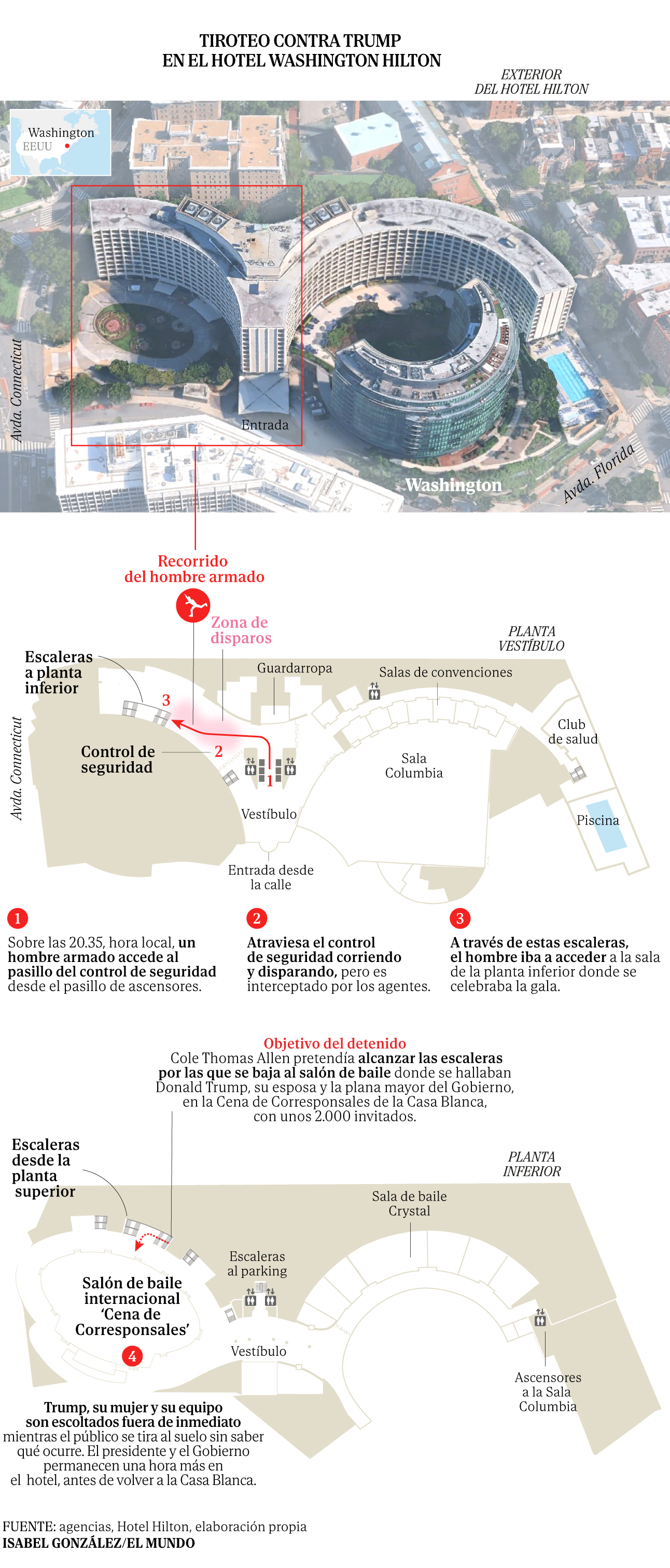 Los protocolos de seguridad exigen que en situaciones como la de anoche las agencias federales comprueben los nombres de los alojados en el hotel, pero Allen no tenía antecedentes ni estaba en el radar de nadie, por lo que no disparó ninguna alarma. El subdirector del Servicio Secreto, Matthew Quinn, ha asegurado que el atacante intentaba perpetrar una "tragedia nacional" mientras todas las miradas estaban puestas en la cena de corresponsales de la Casa Blanca.